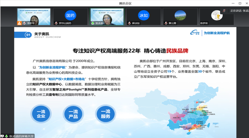随后广州奥凯信息咨询有限公司项目负责人张孟迪对企业进行了介绍,专利分析师李斯华对罗浮山百草油产品技术创新专利导航进行成果发布,培训师薛冰如作“专利信息利用赋能企业高质量发展”知识产权主题培训。